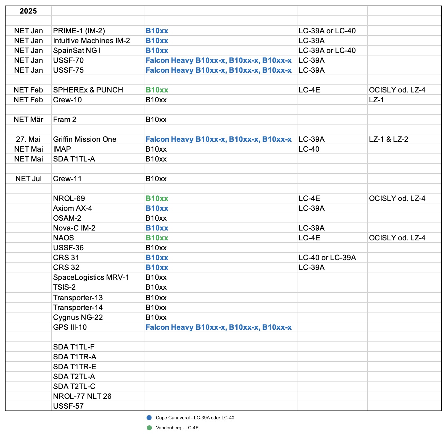 In jedem Fall zeigt der Bau weiterer Drohnenschiffe, dass die Falcon noch lange nicht abgelöst werden soll, sondern deutlich weiter ausgebaut. Von daher hatte ich - schon vor Wochen - 140-150 getippt, in der Erwartung, dass Starship etliche ersetzt; sonst noch mehr.