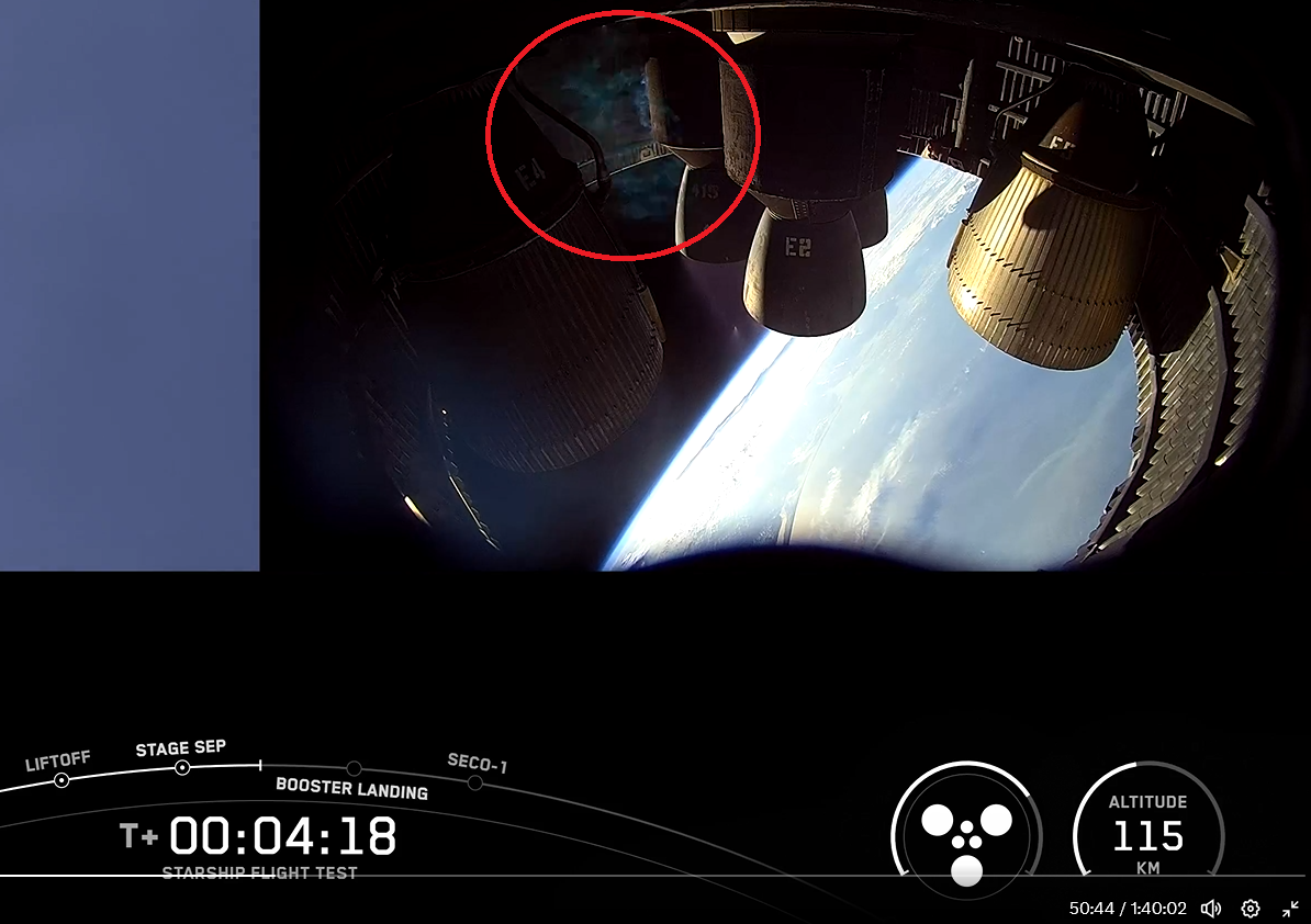 Mir ist schon kurz nach dem Start etwas aufgefallen, ab ca. 00:04:15 sieht man in der Triebwerkssektion des Schiffs eine Art "blaue Flamme" bzw. "blaue Gaswolke" austreten: