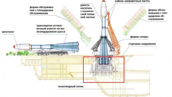 Normalerweise wird diese Baugruppe unterhalb der Rakete unmittelbar vor der Triebwerkszündung in den Raum links davon zurückgezogen. Dort ist sie gegen die Triebwerksstrahlen der Rakete geschützt. Beim Zurückziehen müssen die entsprechenden Vorrichtungen (Motore oder Zugseile) versagt haben.