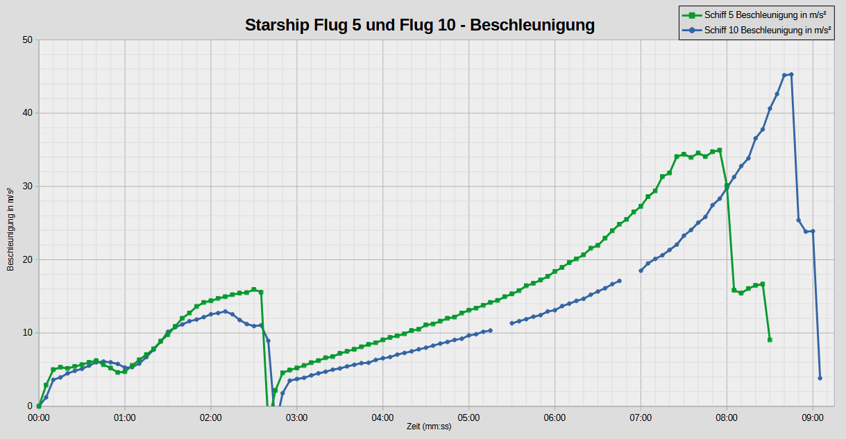 - Spitzernwert, Flug 10: Mit mehr Satelliten an Board hätte der Booster nicht gedrosselt werden müssen und die Beschleunigung wäre aufgrund der höheren Masse nicht mehr so stark. Oder es war ein Belastungstest, denn normal reduziert man die maximale Beschleunigung.
