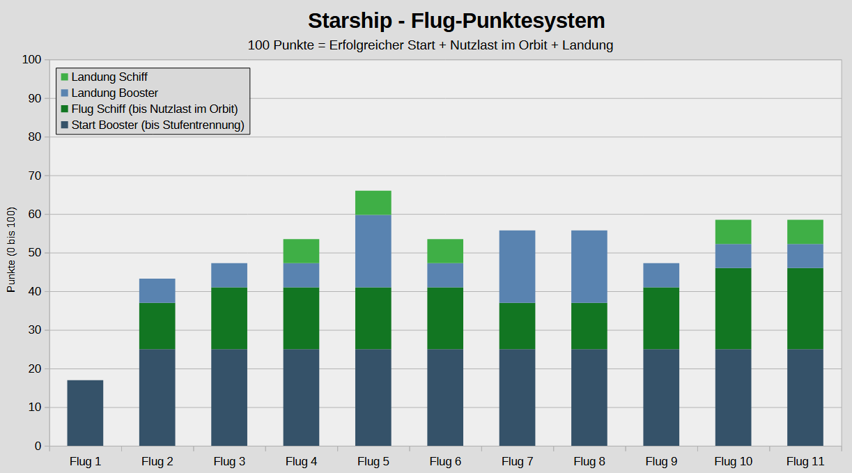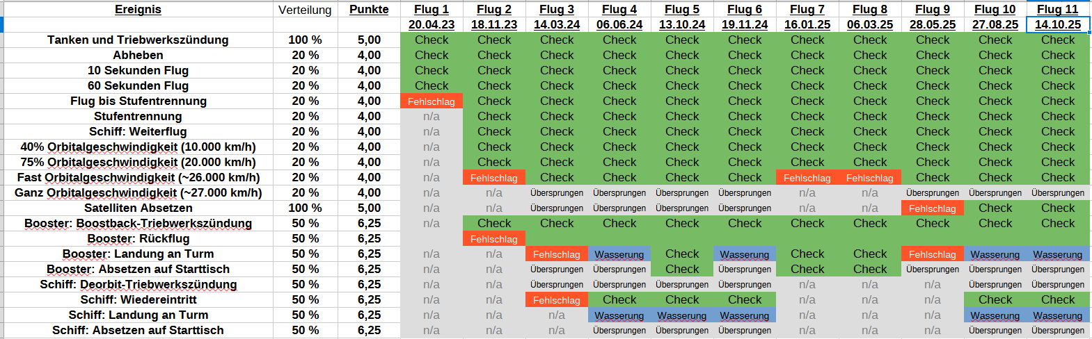 Mögliche Korrekturen: "Deorbit-Triebwerkszündung" wurde bei Flug 10 + 11 nicht übersprungen, sondern erfolgreich mit der Vac-Raptor-Zündung demonstriert. Nur Sekunden, da man ja die Flugbahn nicht wirklich ändern wollte, aber ein echter Deorbit wäre unzweifelhaft möglich gewesen. Hier würde ich die Punkte geben.