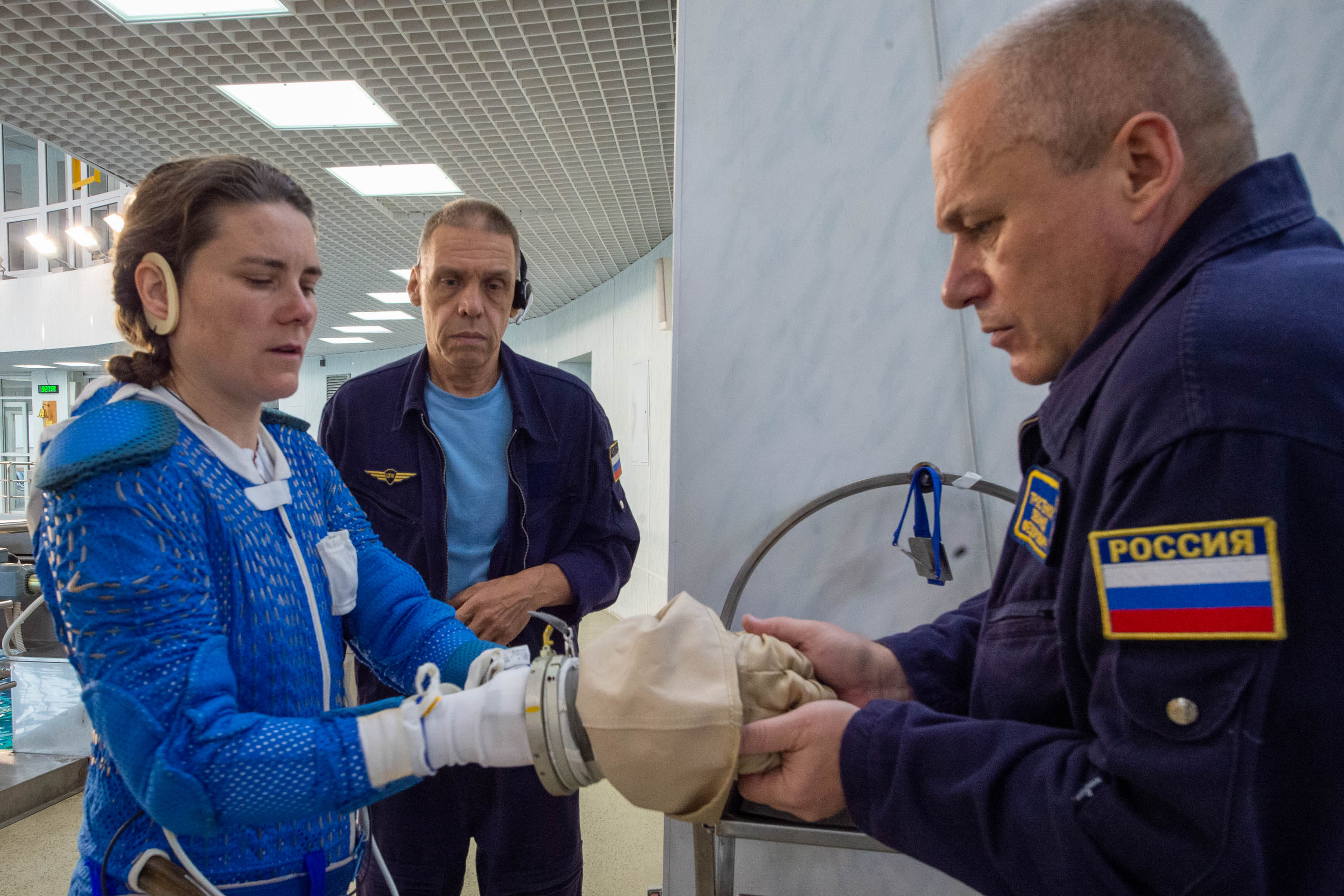 In der Vorbereitung der EVAs von Pjotr Dubrow und Anna Kikina spielen die gute Passform und der Sitz des Raumanzugs eine wichtige Rolle. Die Protektoren an Armen und Beinen müssen richtig sitzen, die Größe der Handschuhe muss stimmen. Es ist sehr wichtig, die Hände (Handflächen, Finger) richtig zu schützen und im Voraus zu wissen, wo durch längeren Druck und Reibung in den Handschuhen Probleme auftreten könnten.