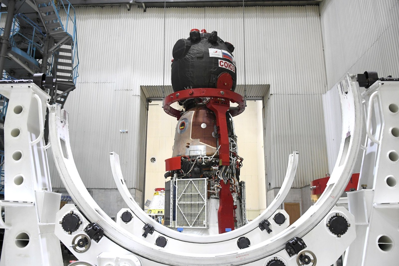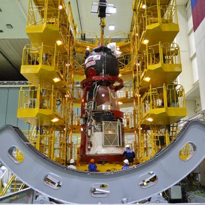 Sojus MS-29 ist auf dem (blauen) Prüfstand von ENERGIA herausgehoben worden