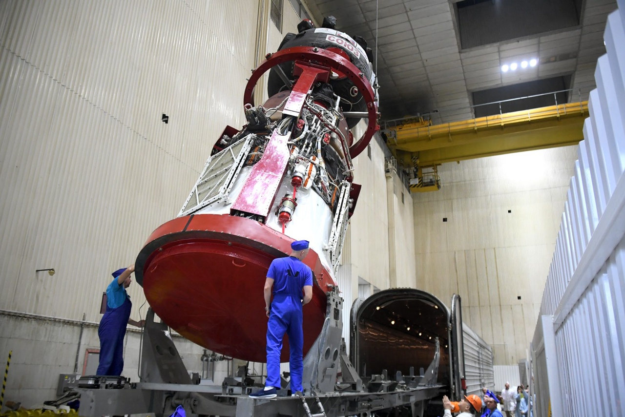 Sojus MS-29 auf der Einschienenbahn im MIK-KA                     Fotos: RKK Energia (Fil. Moskau, Baikonur)