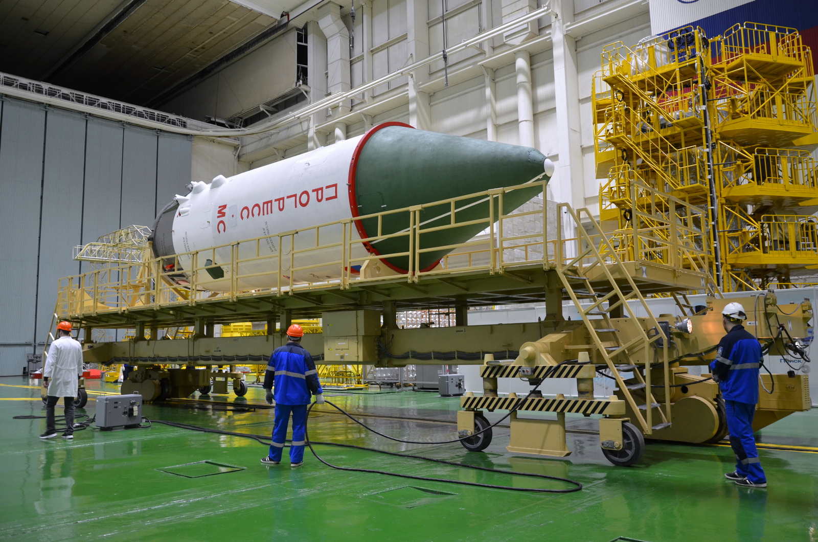 Das Frachtraumschiff Progress MS-33 wird weiter intensiv für den Start vorbereitet, denn schon morgen erfolgt das "Rollen" der Nutzlastverkleidung über P-MS-33...