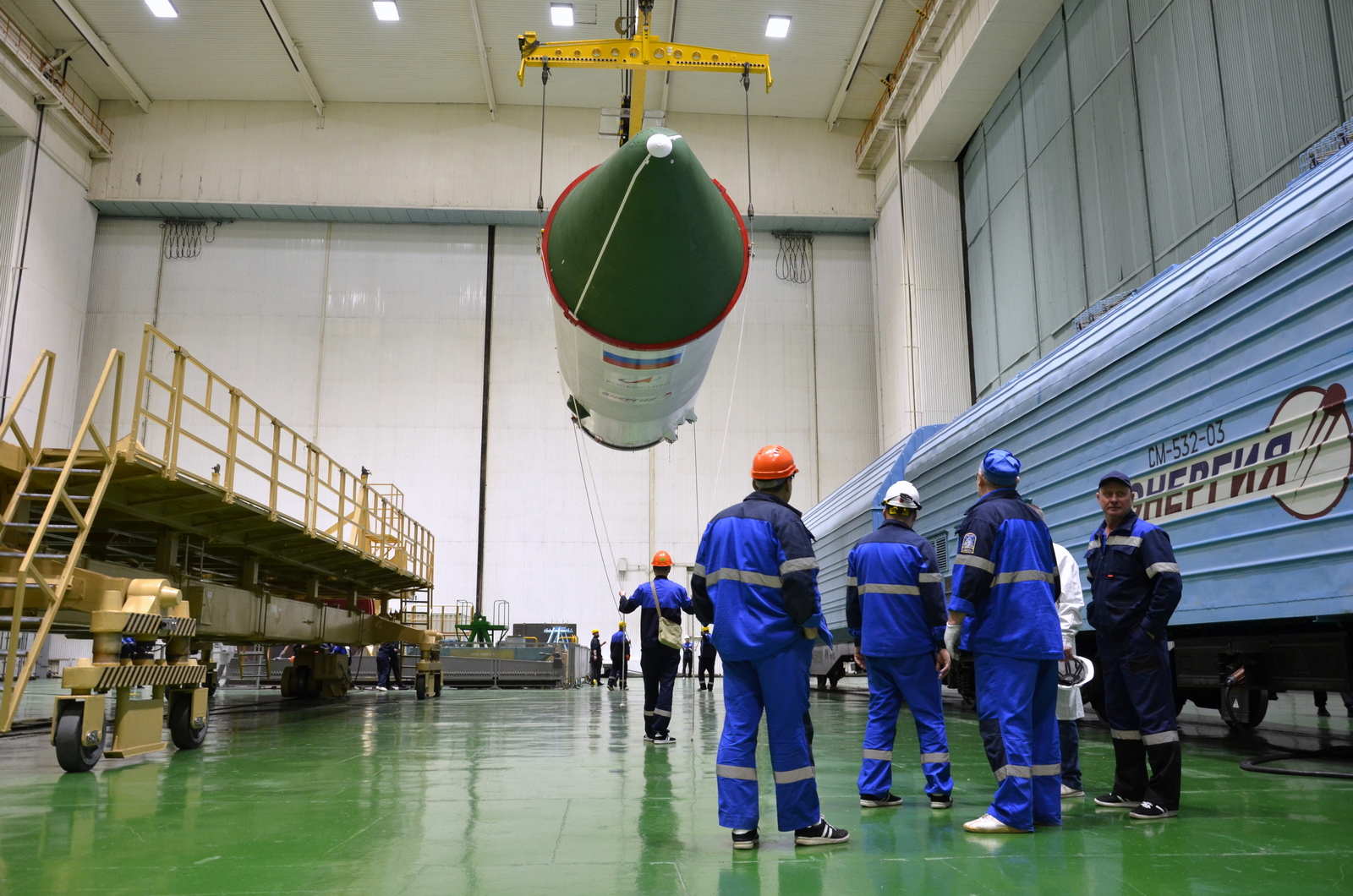 In der Halle wird Progress MS-33 auf den Prüfplatz gehoben                   Fotos: RKK ENRGIA/Fil. Baikonur