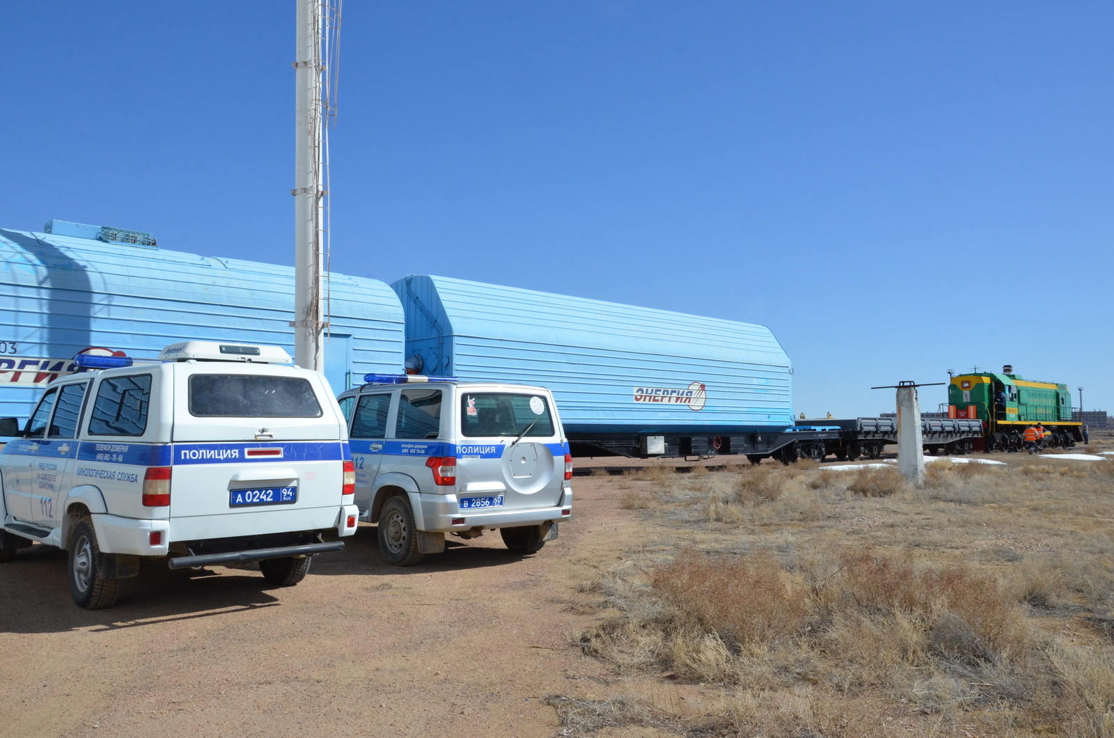 Die Fahrt zur Rakete beginnt                                                  Fotos: RKK Energia/Fil. Baikonur