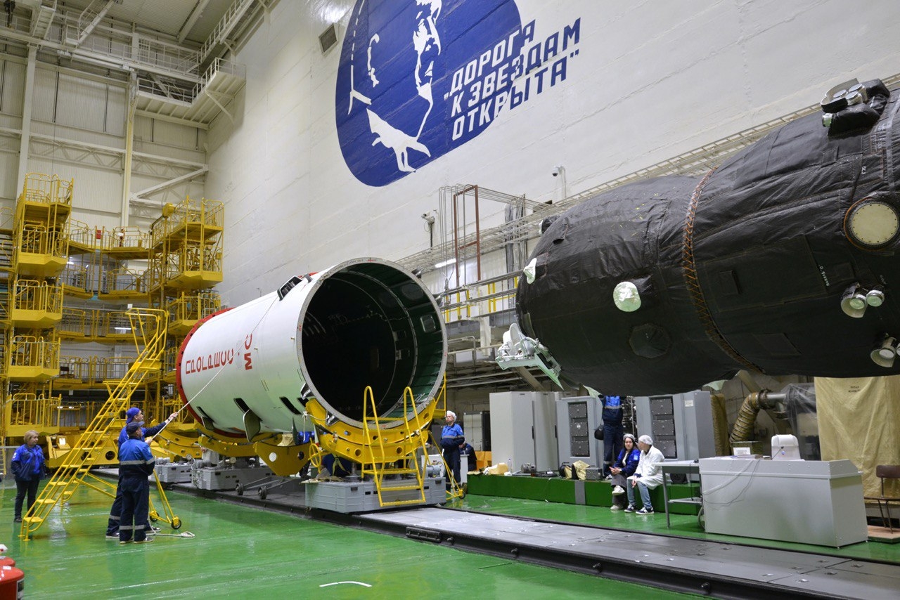 Die Nutzlastverkleidung wird über die daneben liegend hängende Progress MS-33 gerollt und dann mit der Übergangs-Sektion verbunden.