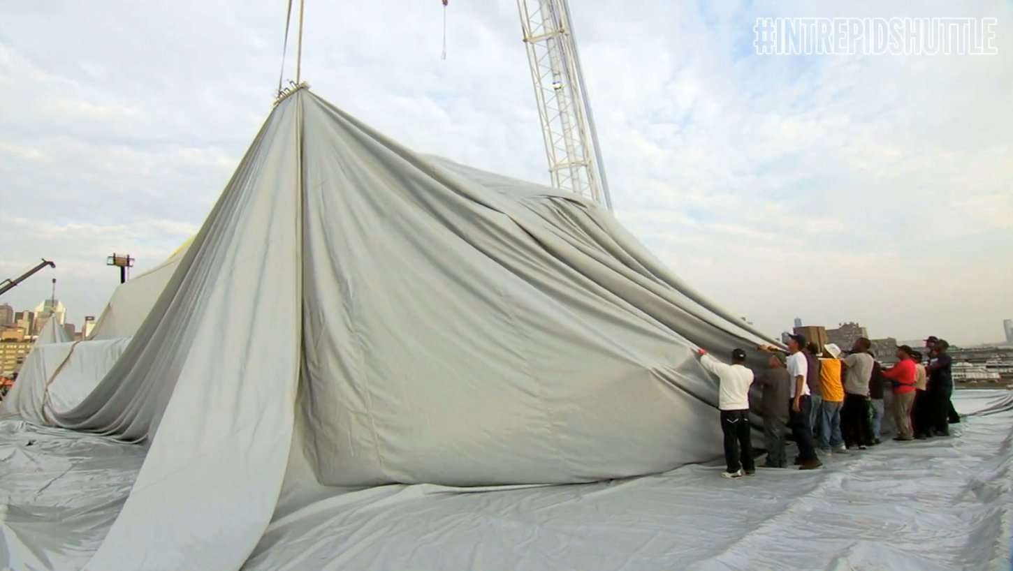 Nur drei Monate später traf in der Nacht vom 29./30. Oktober 2012 der schwere Hurrikan Sandy New York City und überflutete den Pier, an dem die Intrepid vor Anker liegt. Dadurch wurden sowohl die Stromversorgung als auch die Notstromaggregate der Traglufthalle überflutet, woraufhin diese eingestürzt ist, wie man auf den folgenden Bildern sehen kann.