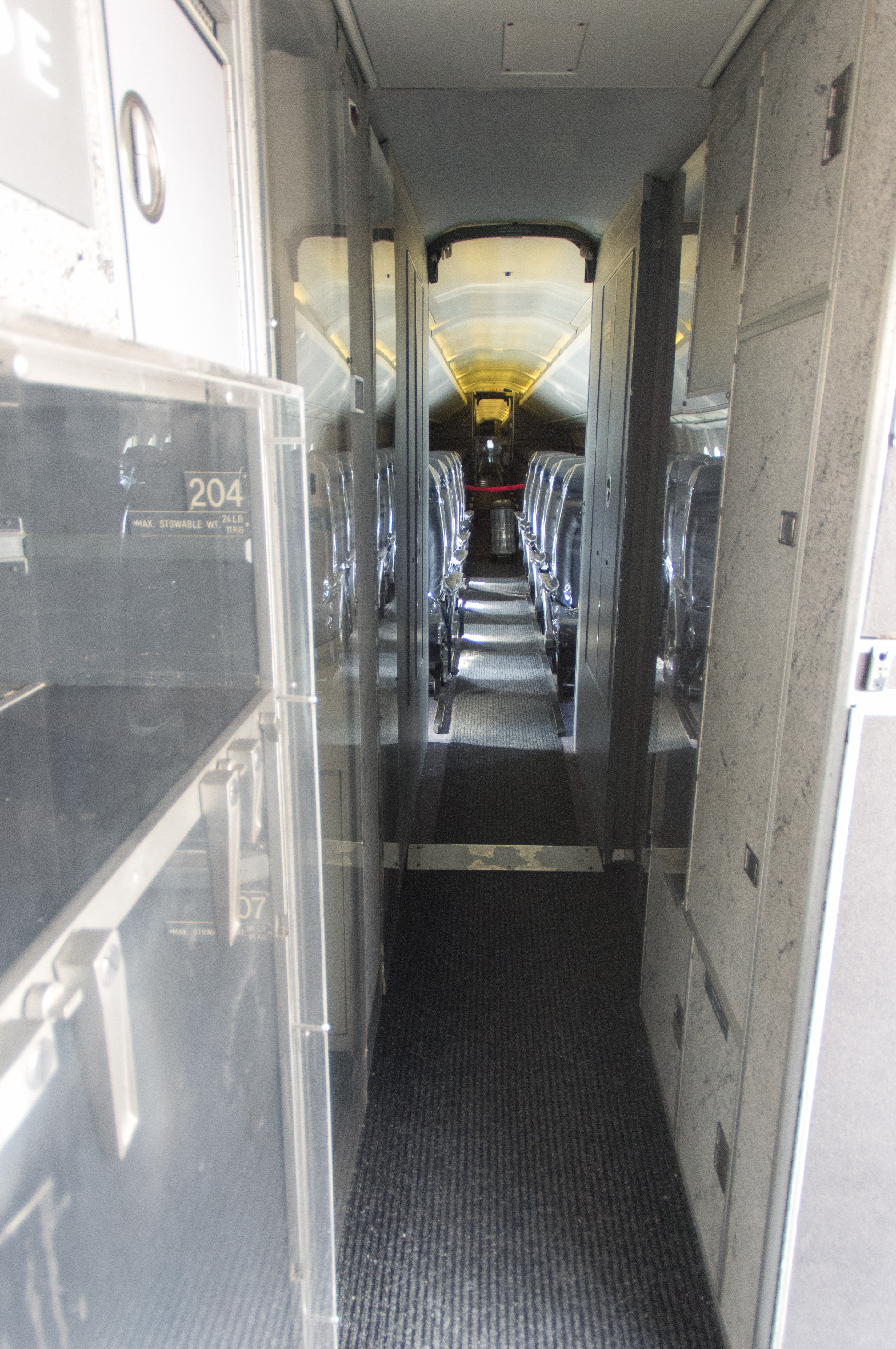 Blick vom Einstieg an der Bordküche und den Toiletten vorbei in den Passagierraum
