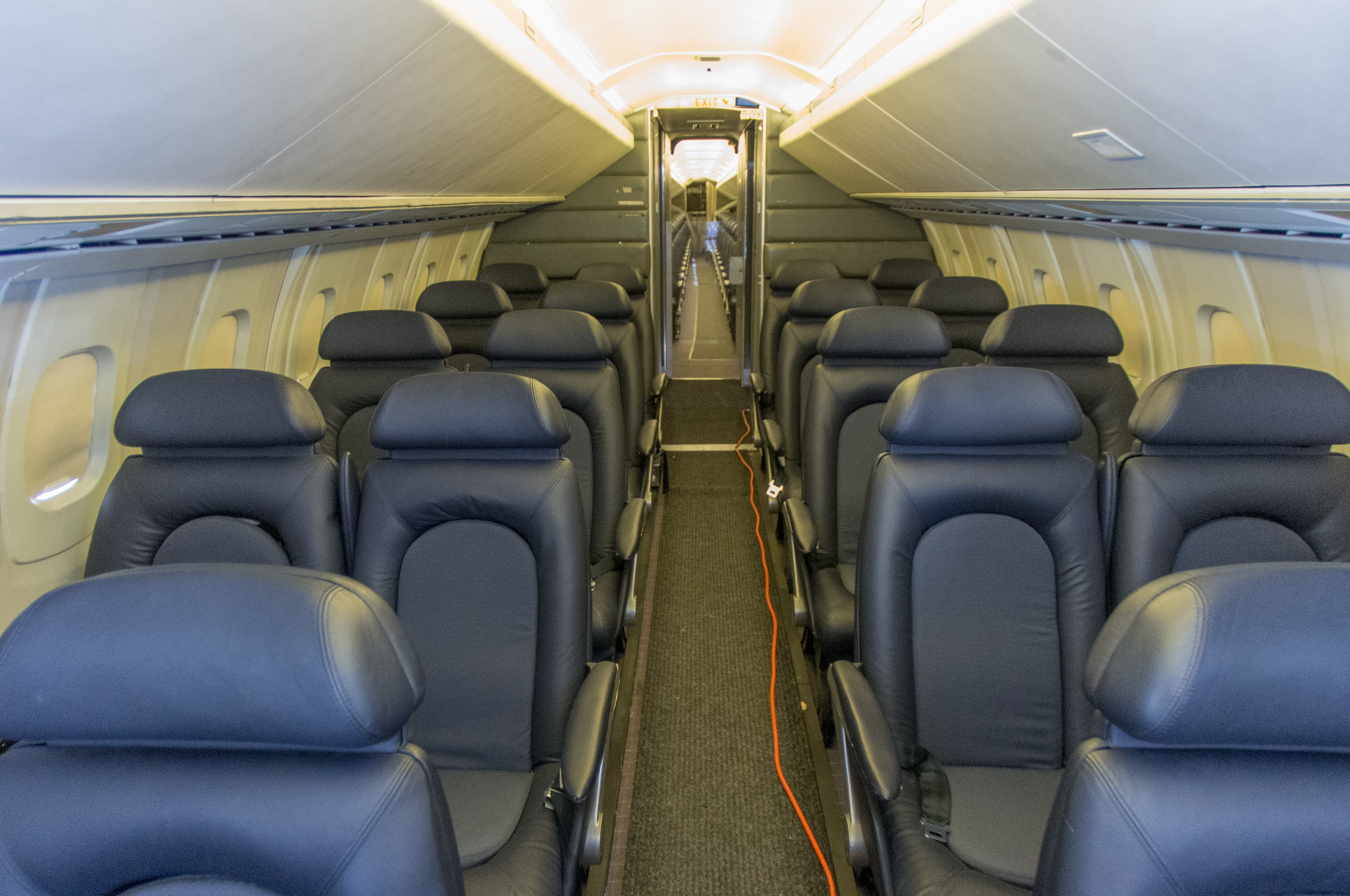 Blick in die Kabine. Queen Elizabeth II pflegte immer auf Sitz 1A Platz zu nehmen, das ist der Sitz ganz links ausserhalb des Bildes. Dieser und Sitz 1B wurden um 180° gedreht, die Sitze 2A und 2B herausgenommen damit die Queen arbeiten konnte. Mehr zu den Sitzgewohnheiten Promminenter in einem Video.