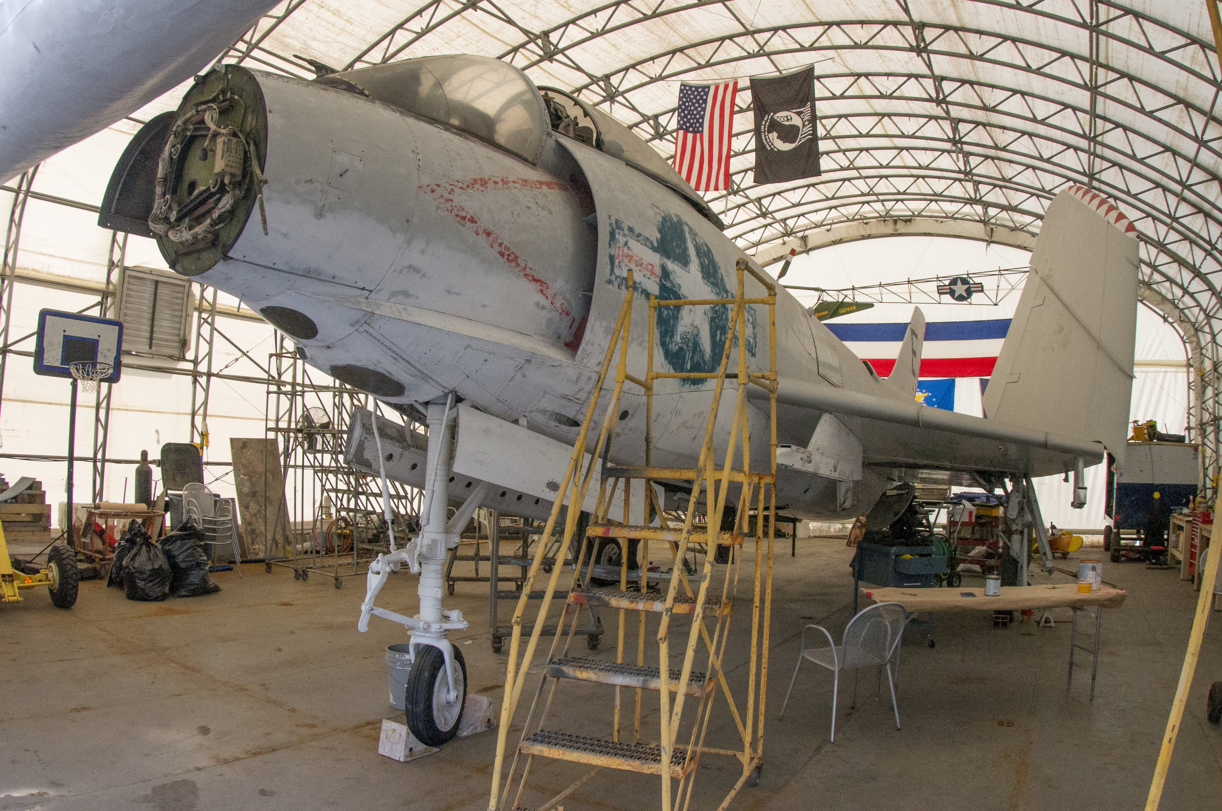 Auf dem Weg dorthin stand ein großes Zelt, ein freudlicher ältere Herr in Fliegerjacke lud uns ein in das Zelt zu schauen. Dort wurde gerade eine McDonnel F3H-2N Denon restauriert: