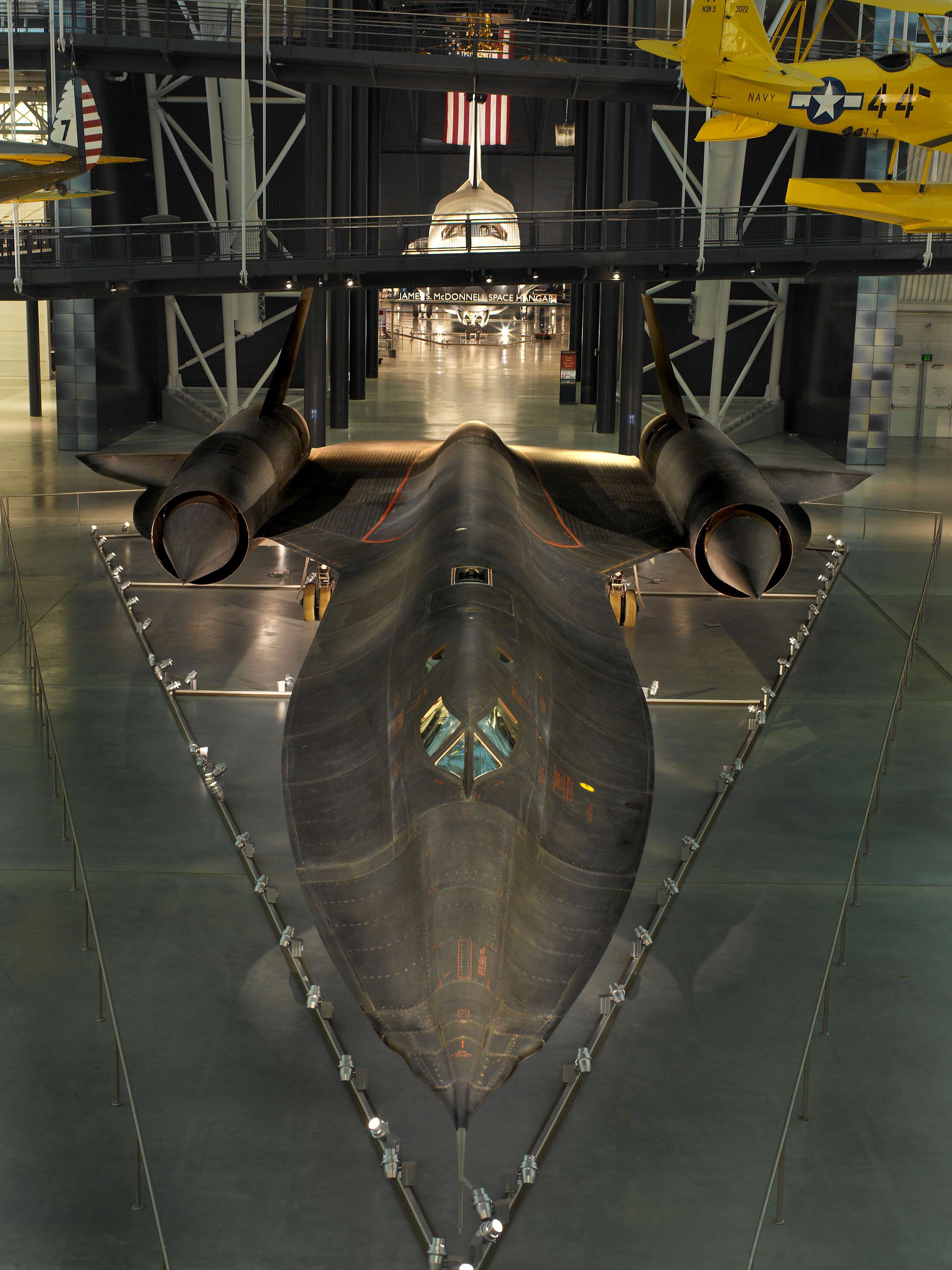 Die SR-71A Blackbird habe ich voriges Jahr in Washington zusammen mit der Discovery im Steven Udvar-Hazy Center gesehen und genauer unter die Lupe genommen, die im folgenden Bild in der Halle dahinter zu sehen ist.