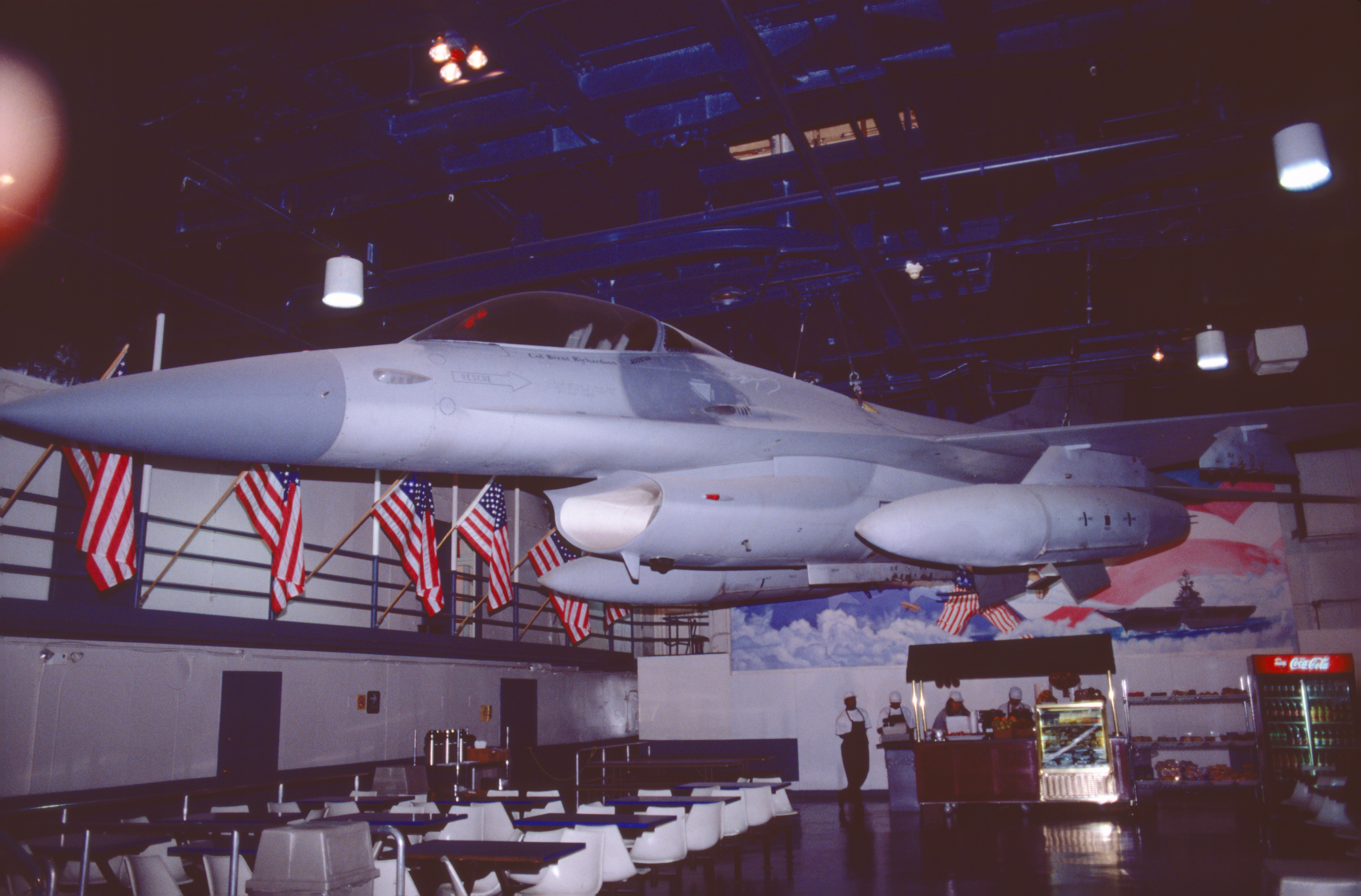 Unter der Decke auf dem Hangardeck war 1999 eine General Dynamics F-16 Fighting Falcon in Flugstellung aufgehängt...