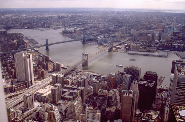 Blick von der Aussichtsplatform Richtung Nord-Ost über den East River, in der Mitte die Brooklyn Bridge, links die Manhattan Bridge