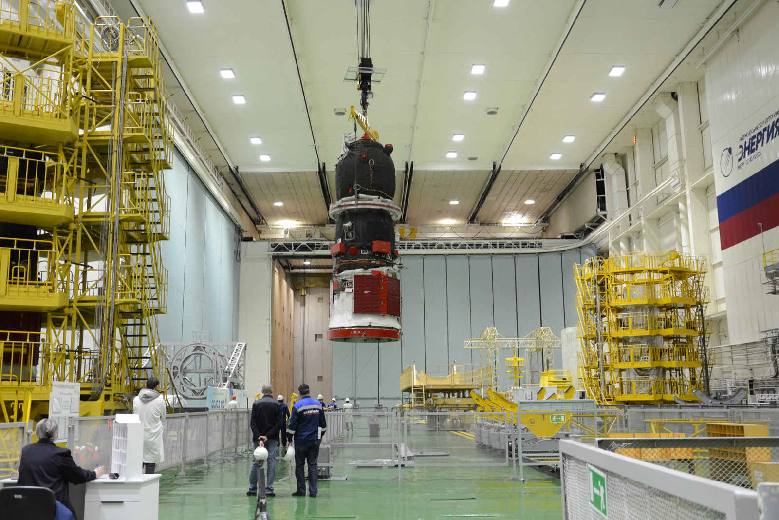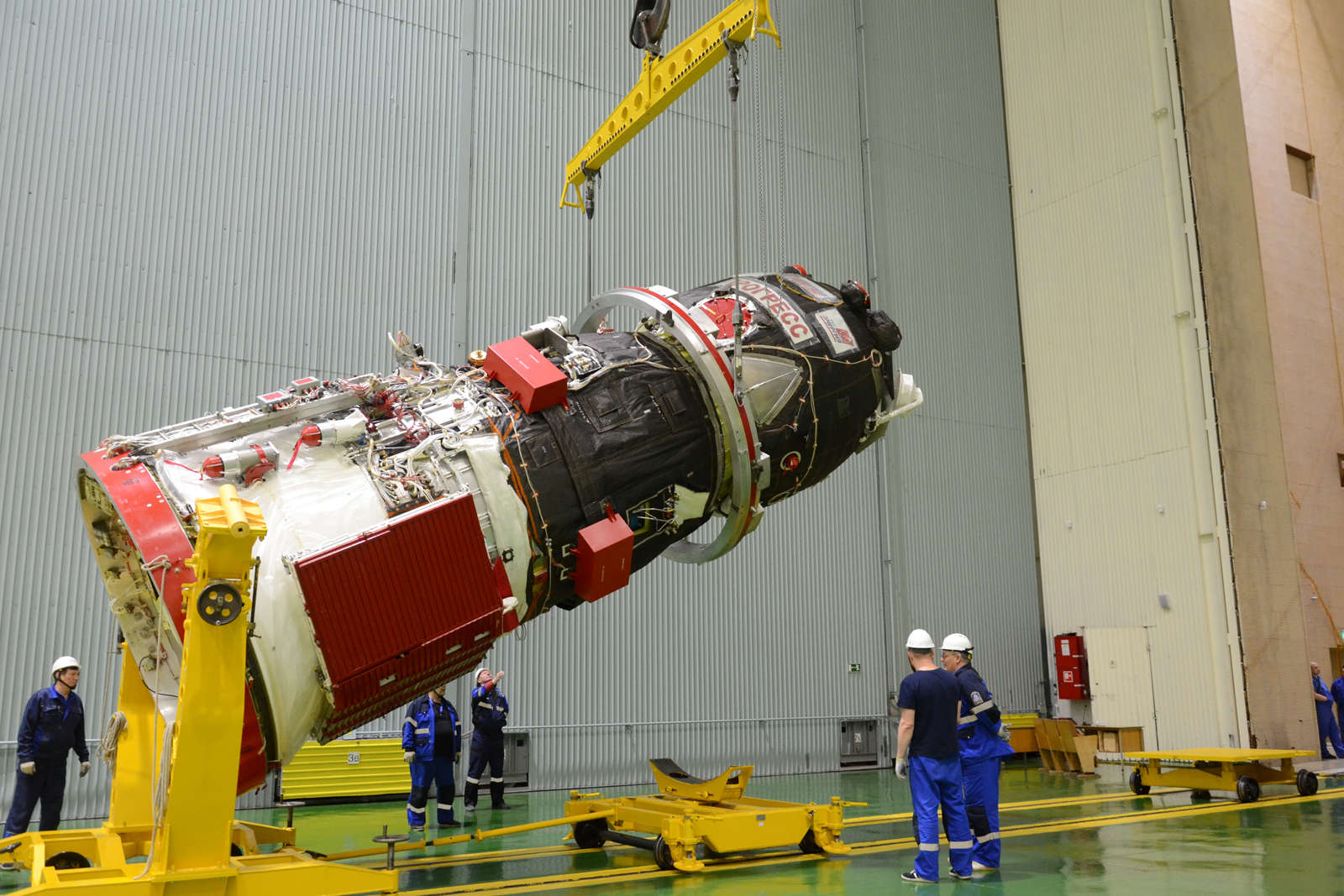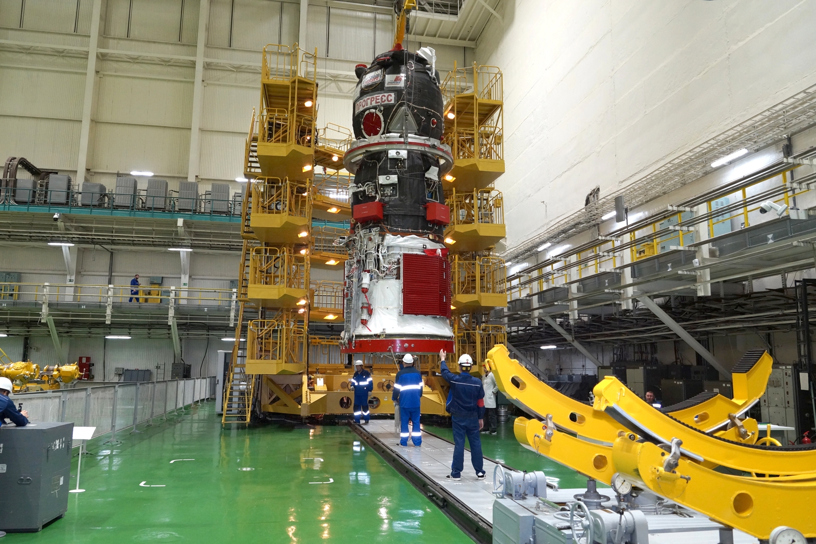 Progress MS-34 wird mit dem Kran umgesetzt ...