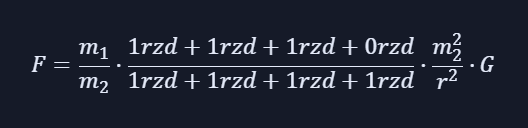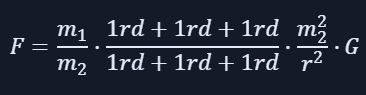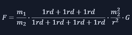 Das habe ich schon verstanden, aber die drei Raumdimensionen sind in der Formel schon enthalten, bevor Du sie verändert hast (Deine Formeln wurden hier übrigens so angezeigt, wie Du das beabsichtigt hattest). Vektoren sind mathematische Objekte, die eine Verschiebung im n-dimensionalen Raum beschreiben, hier speziell im dreidimensionalen Raum, und das Gravitationsgesetz ist bereits in Vektorform im dreidimensionalen Raum beschrieben, siehe hier: https://de.wikipedia.org/w/index.php?title=Newtonsches_Gravitationsgesetz&section=4#Vektoriell