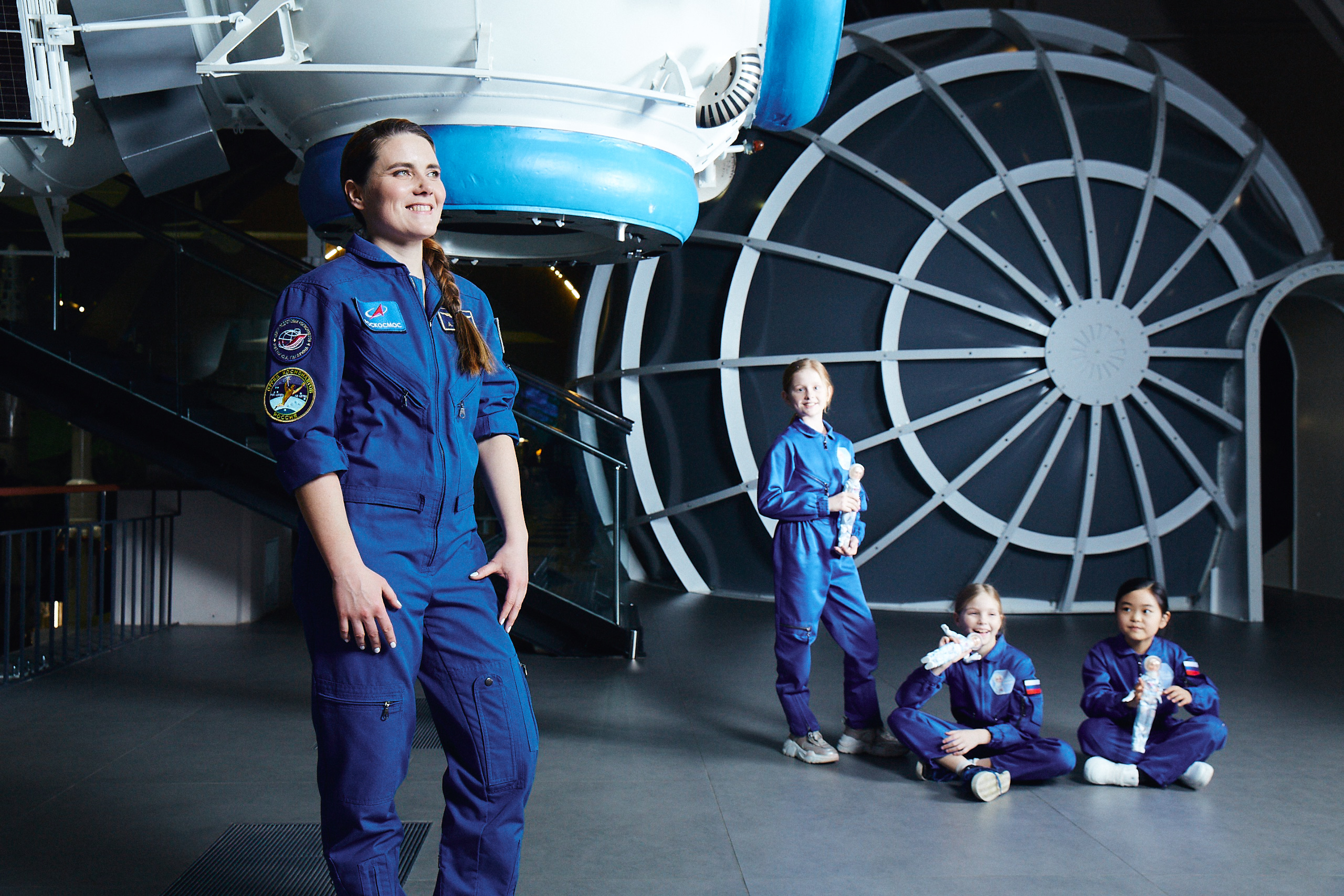 Anna Kikina und die Kinder mit der Astronautin "Anna"-Puppe im KOSMOS - Pavillon                          Bild: @Roskosmos