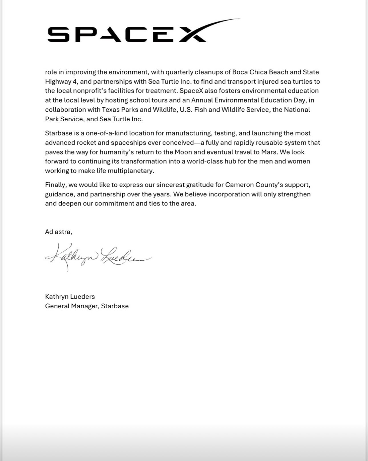 Hiernach hat Elon Musk 2020/2021 erstmals öffentlich davon gesprochen hier eine eigene Stadt "Starbase, Texas" zu gründen, aber bis heute ist der Name anscheinend noch nicht genehmigt.