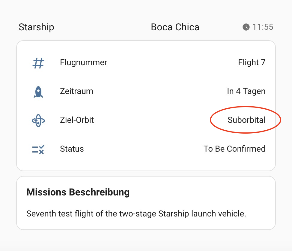 Ich persoenlich mag seine Definition, da aus rein energetischer Sicht Welten zwischen einem sub-orbitalem Flug alla New Shepard und eben diesem Starship Flug Nr.6 liegen.