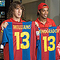 Geschenke für die Expedition 13: Puyol und Ronaldinho halten personalisierte FC Barcelona Shirts