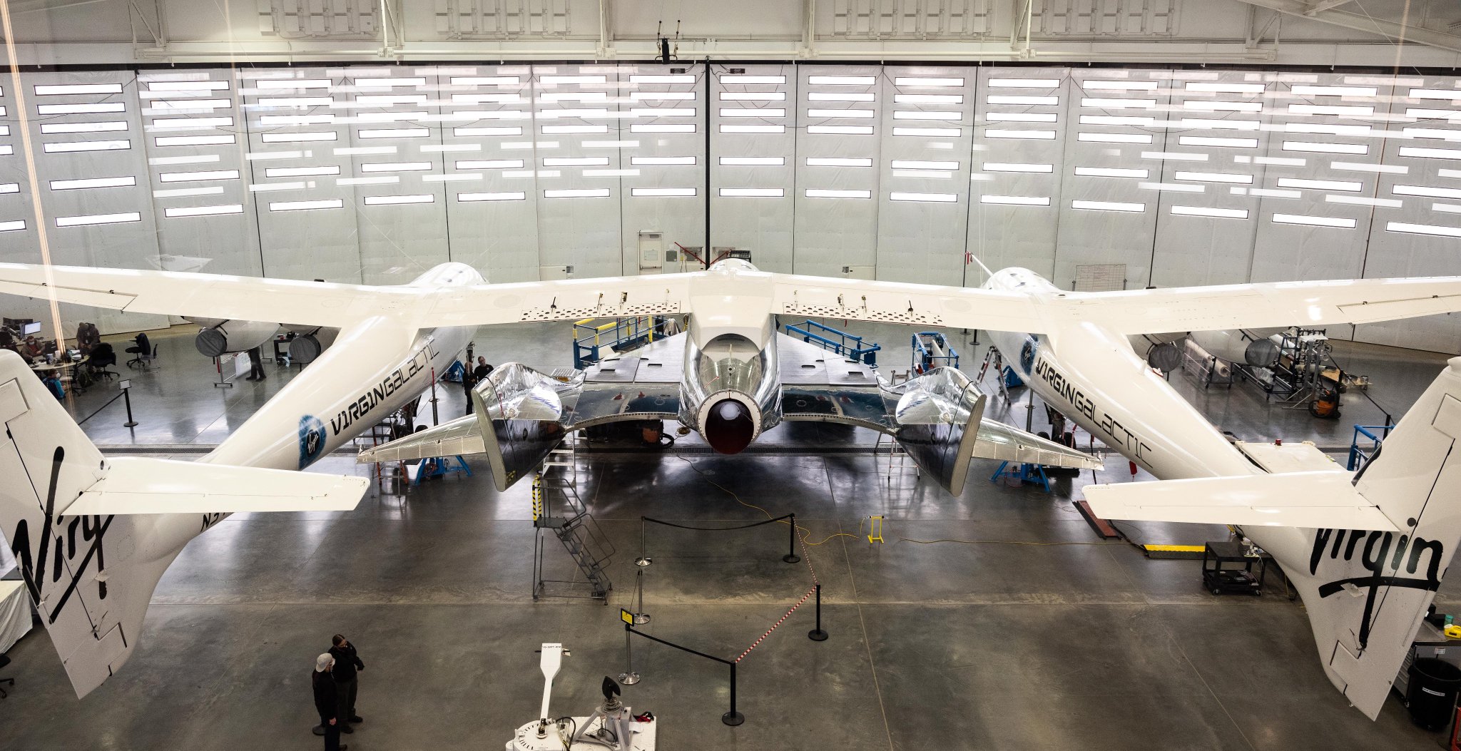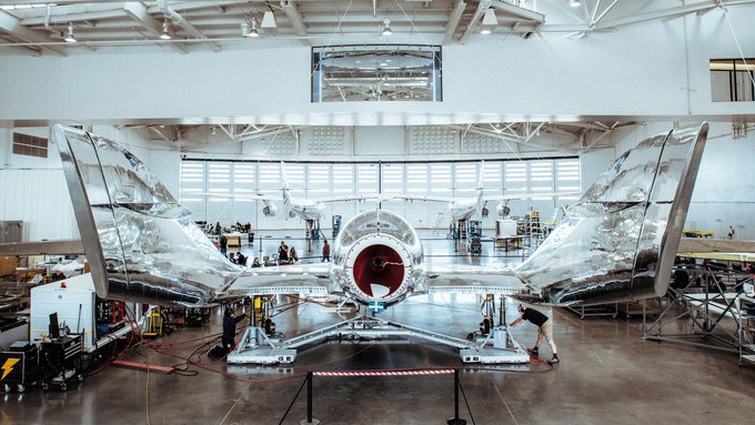Auf Twitter gibt es auch ein schönes Bild von den zwei SS2-Raumschiffen (links das schon fliegende VSS Unity und rechts das in Bau befindliche neue Raumschiff):