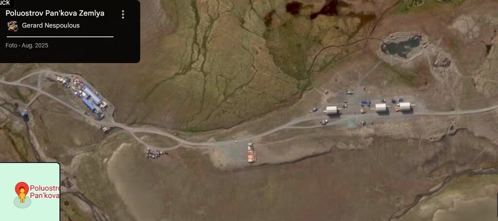 Aufnahme vom August 2025, Pankovo auf Nowaja Semlja; die beiden blauen Container links sind die Startanlagen für Burewestnik:
