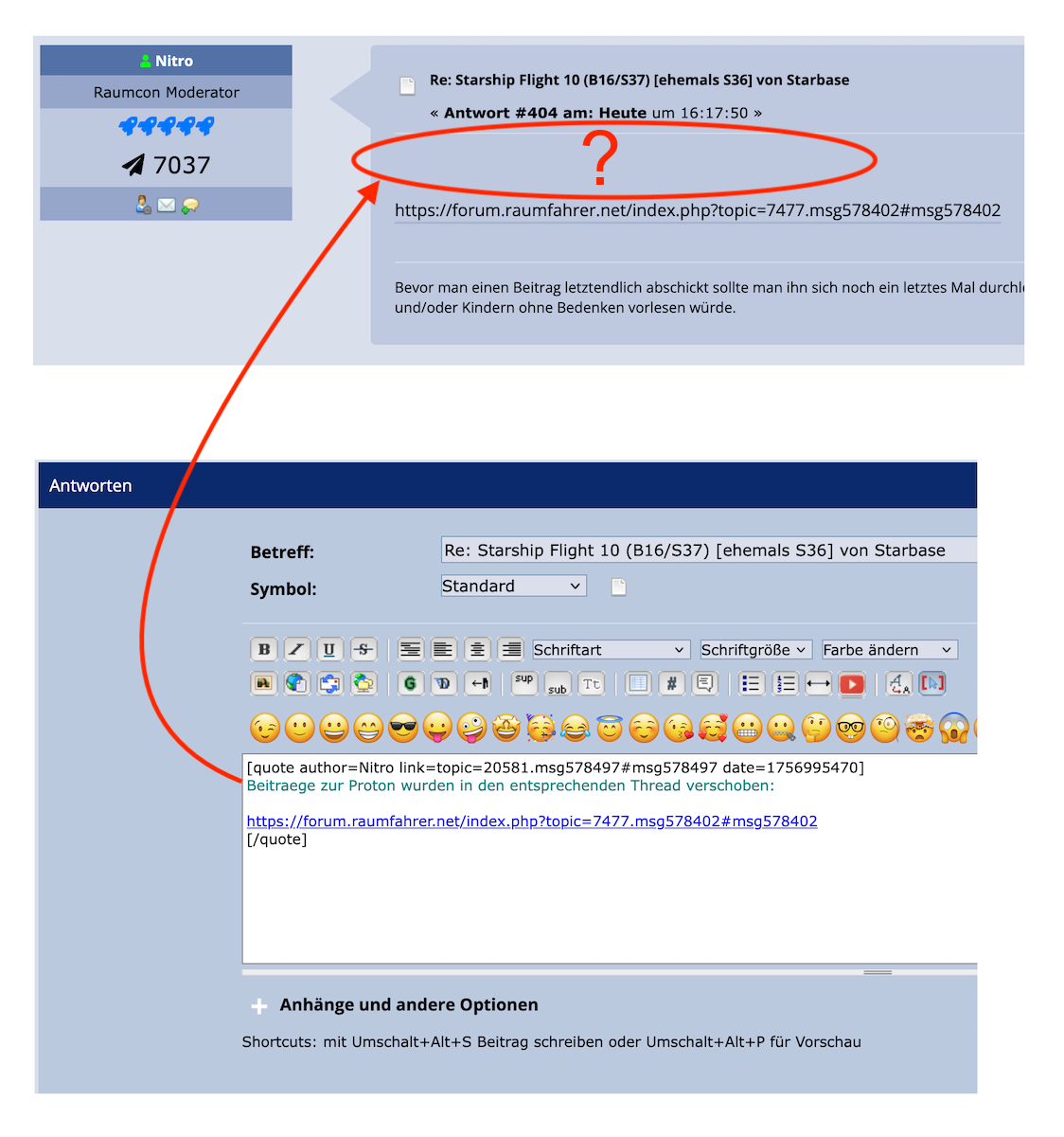 Erst wenn ich dann auf "Zitat" klicke, sehe ich was der Mod geschrieben hat. Komisch ist dieses Mal, dass der Link angezeigt wird.