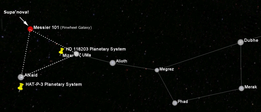 Die Supernova PTF 11kly  in der Feuerrad-Galaxie, welche auch Messier 101 genannt wird, befindet sich in "Big Dipper", auch als Ursa Major Konstellation  bekannt.