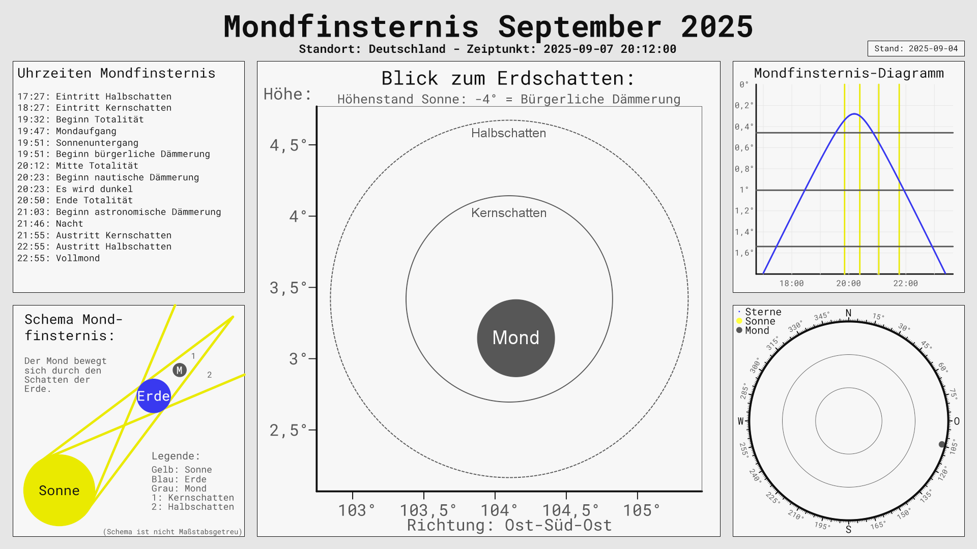In der Mitte wird der Mond im Erdschatten dargestellt. Gedreht und justiert auf den jeweiligen Standort berechnet. Natürlich ändert sich die Position vom Schatten und vom Mond nicht, wenn man wo anders steht, aber man schaut aus einer anderen Richtung und sieht so andere Bereiche vom Mond. Unten links ist ein Schema, wie eine Mondfinsternis entsteht und unten rechts ist auf dem Kompass abgebildet, wo der Mond gerade steht. Es fehlt noch oben links ein Ablaufdiagramm und oben rechts eine Ereignisauflistung. Das Bild ist in "Full-HD" Auflösung, ich empfehle das öffnen im Vollbild auf dem ganzen Monitor.
