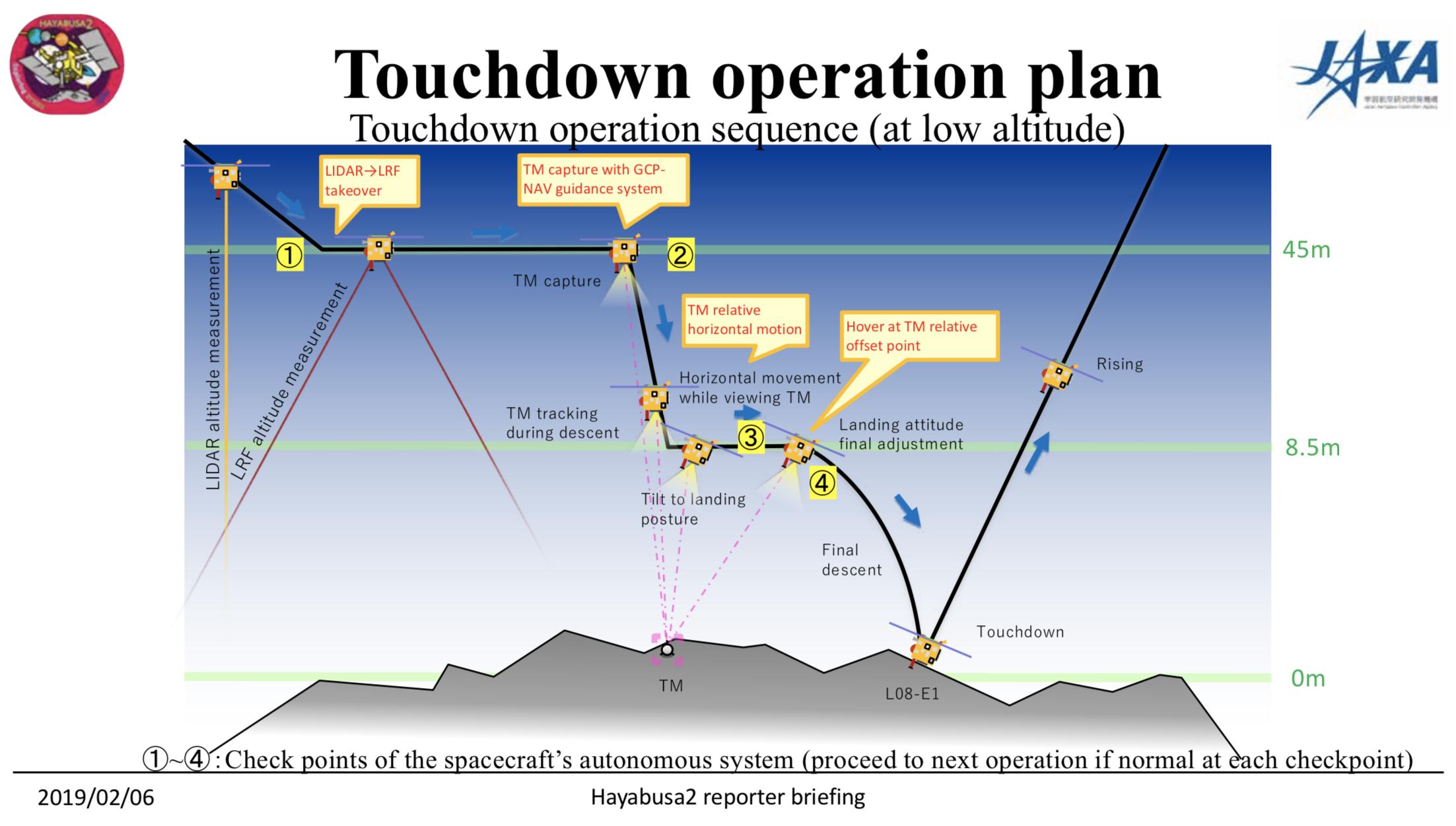 Dort wird geprüft ob der Laser Range Finder (LRF) funktioniert, das ist ein mehrkanaliges Entfernungsmessgerät, das für die Navigation im Nahbereich eingesetzt wird. Außerdem wird zum letzten Mal getestet, ob der Marker, der im letzten Jahr abgeworfen wurde, eindeutig von der Steuerungssoftware identifiziert wird. Dieser Marker ist ein mit Pellets gefülltes Stoffsäckchen, genäht aus einer hochreflektiven Folie, das sogar aus einer Entfernung von 20 km als heller Lichtpunkt auf Ryugu erkennbar ist.