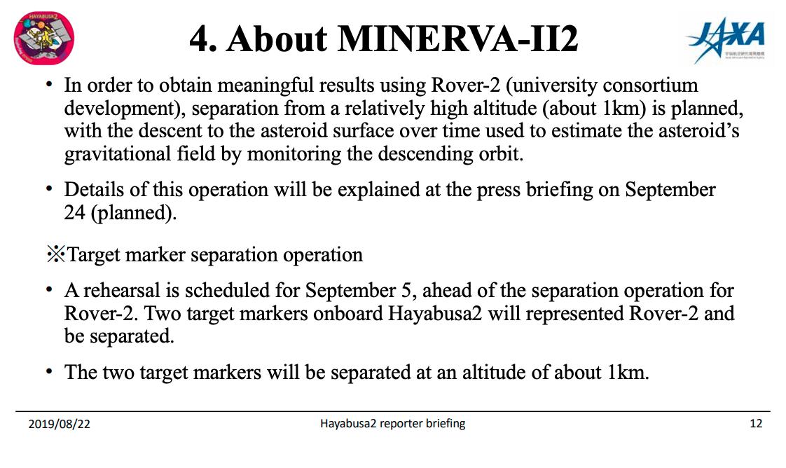 Hayabusa-II wird den "Rover" Minerva-II-2 morgen um ca. 7:00 - 9:00 MESZ * auf eine Bahn in Richtung des Äquators in einer Höhe von ca. 1 km abwerfen. Anschließend steigt die Sonde auf eine Höhe von 8 - 10 km und wird die Bahn des Geräts bis zum Aufschlag, der für den 8.10. erwartet wird, beobachten.