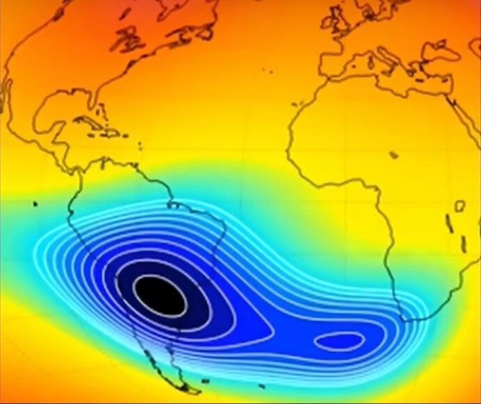 Messungen von NASA und ESA zeigen eine langsame Veränderung der Südatlantischen Anomalie, eines lokalen Minimums der Magnetfeldstärke über dem Südatlantik und Südamerika: in ihrem Ostteil bildet sich aktuell ein zweites Nebenminimum aus, das sich bis Südafrika erstreckt: