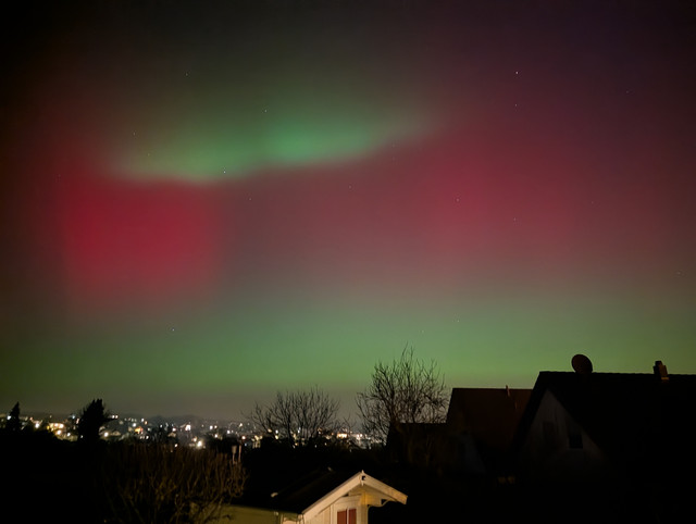 tolle Polarlichter! Eben gerade aus dem eigenen Garten (mit Handy im Nachtsichtmodus) dieses Bild aufgenommen. Gießen, ca. 60 km nördlich von Frankfurt am Main. Hab ich hier noch nie gesehen  **-)